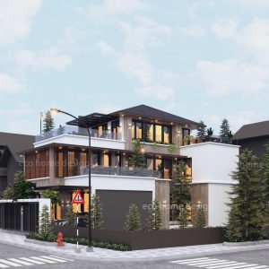 Biệt thự 3 tầng hiện đại 2021 thu hút mọi ánh nhìn về mặt kiến trúc. Phong cách táo bạo thể hiện ngay tại mặt tiền với vô số đường nét hình học song song. Vật liệu chính được sử dụng là kính, kim loại. Lẫn trong tổng thể hiện đại là yếu tố truyền thống từ mái thái – mang đến vẻ đẹp sang trọng, bề thế, vững chãi cùng nét mới lạ cho không gian ngoại thất nổi bật.