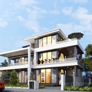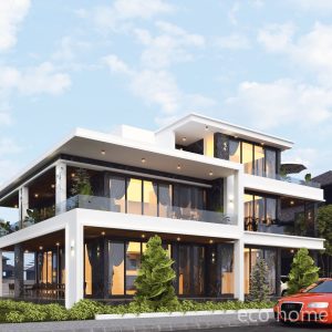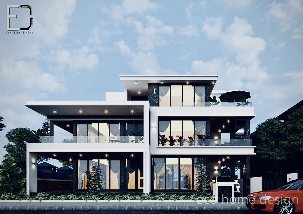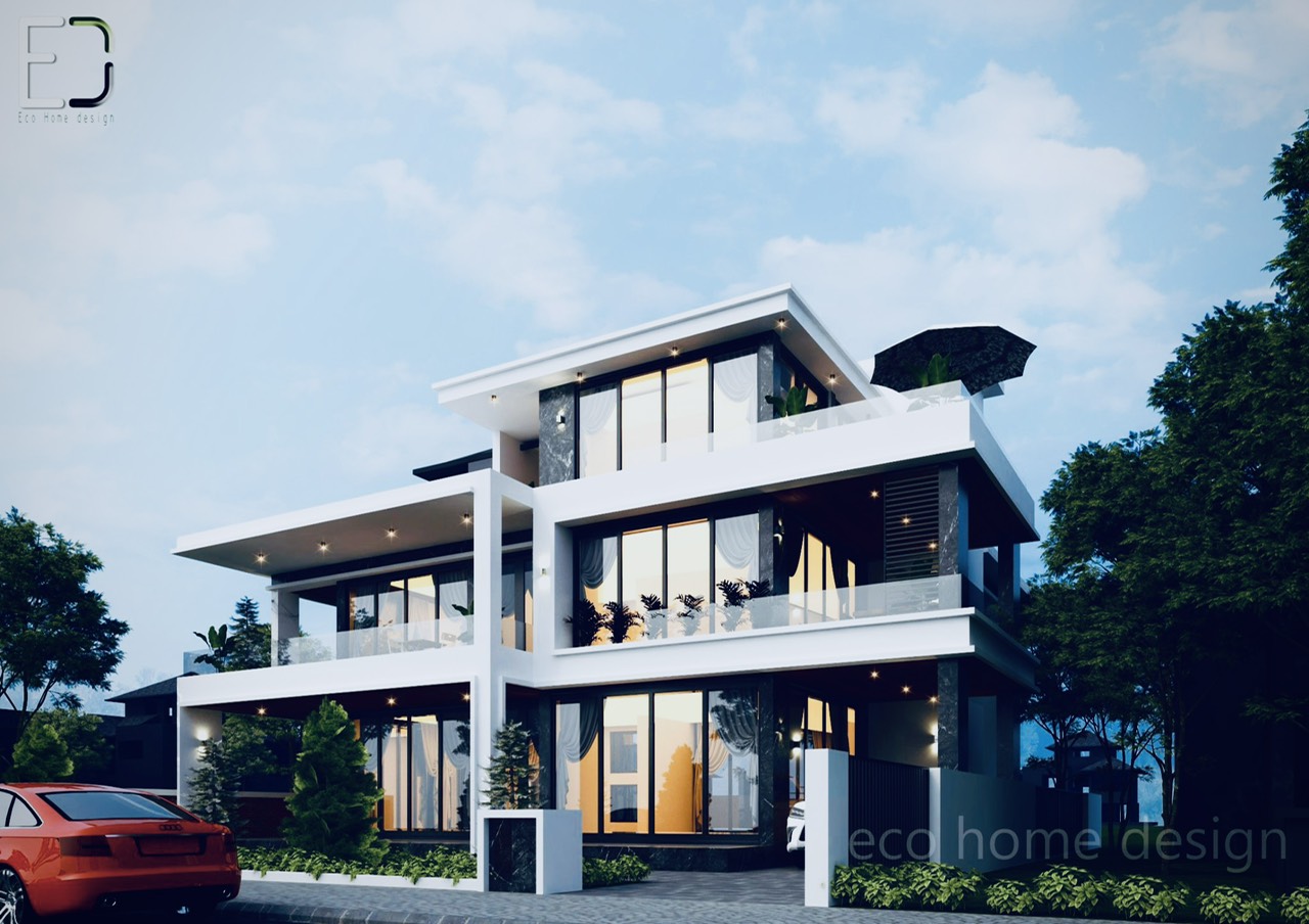 Biệt thự hiện đại với nhiều khoảng xanh này gồm 3 tầng với nét kiến trúc hiện đại.