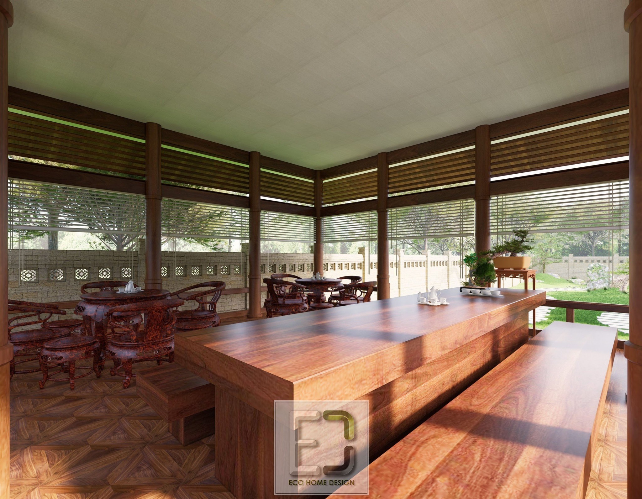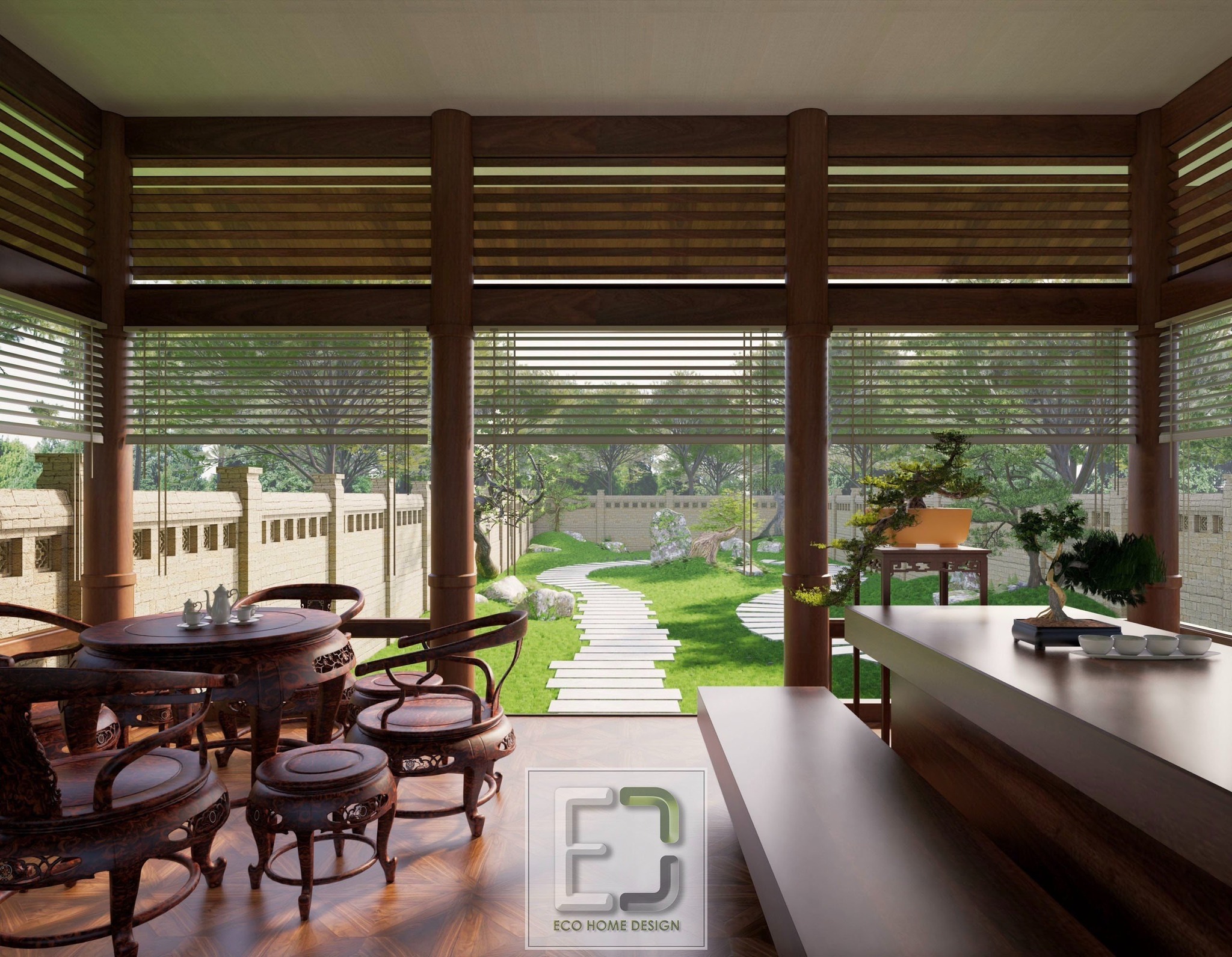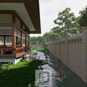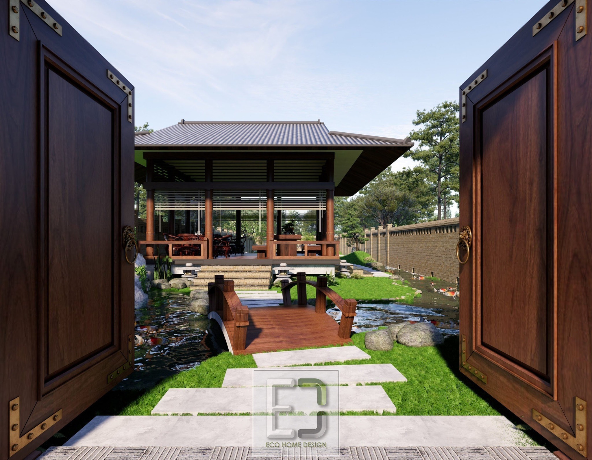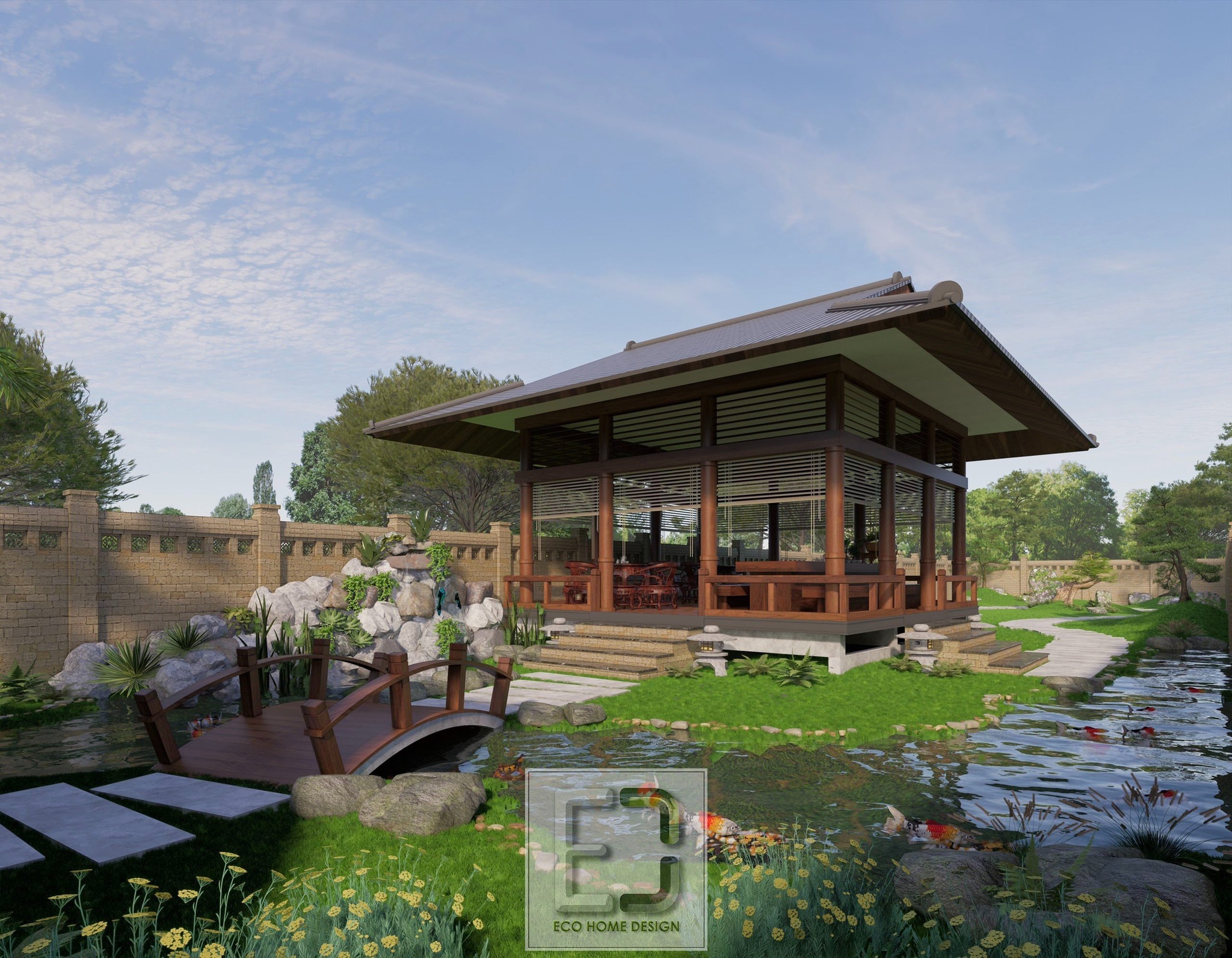Ao cá được thiết kế thành những dải nước uốn quanh khu vườn cùng với tiểu cảnh mang đậm phong cách Nhật Bản – truyền thống và tinh tế. Chòi nghỉ chân trong khu vườn được làm hoàn toàn bằng gỗ mang lại một cảm giác mát mẻ, thân thuộc với thiên nhiên nhưng vẫn làm thể hiện được đẳng cấp của gia chủ.