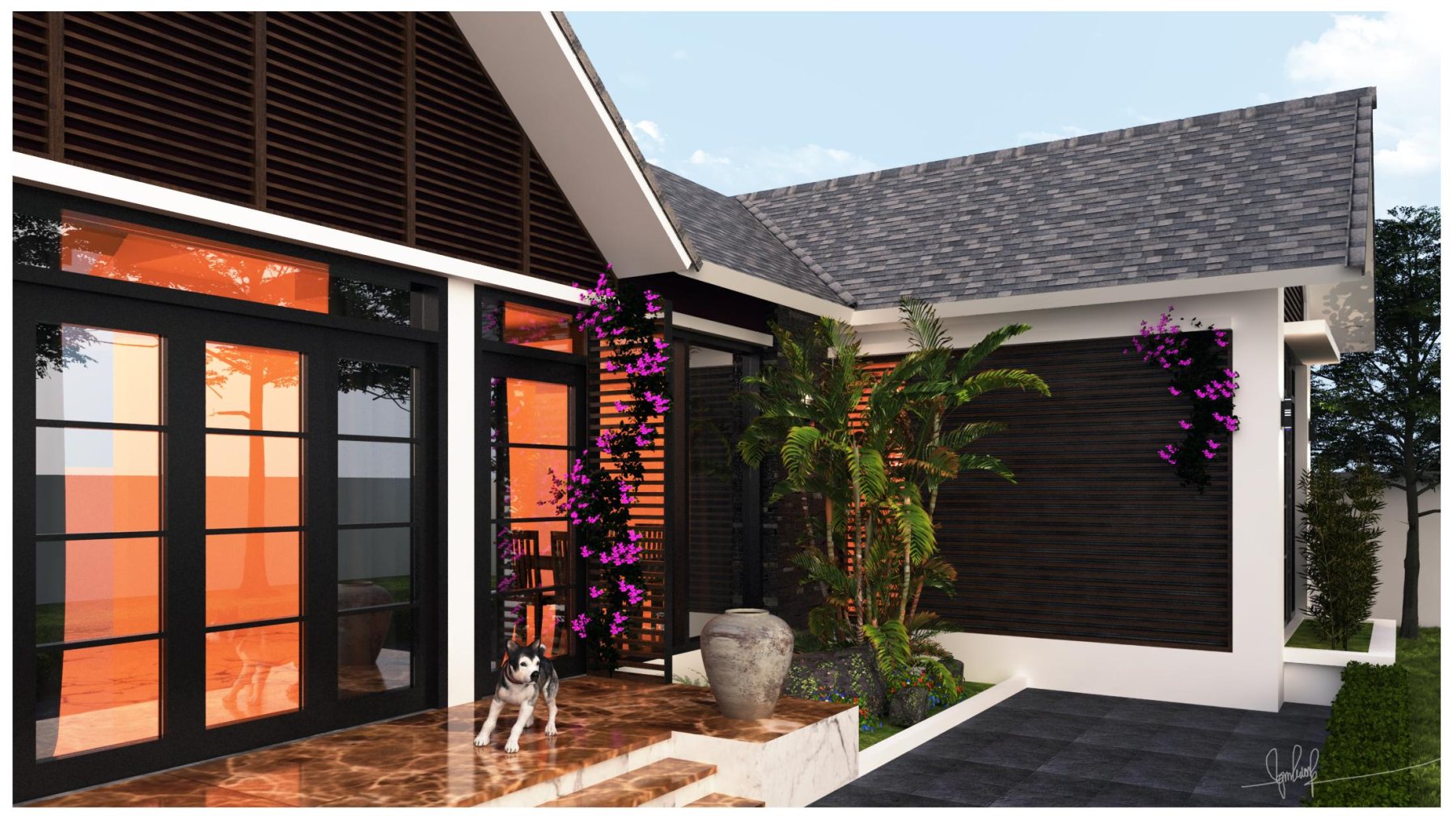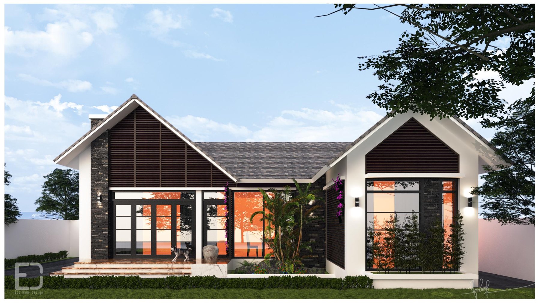 Vẫn là kết cấu 3 gian thông thường nhưng cách điệu trong việc thay hoàn toàn tường thành cửa kính, cùng phần mái thái đẹp tinh xảo đã biến ngôi nhà khác hẳn thiết kế truyền thống.