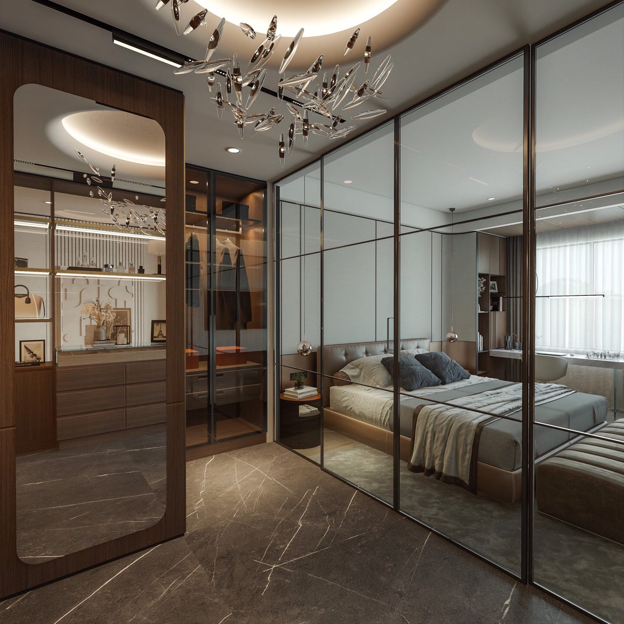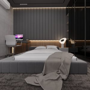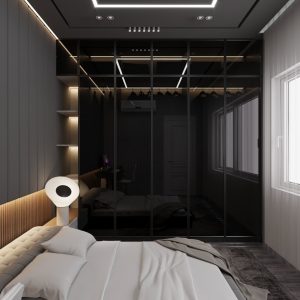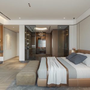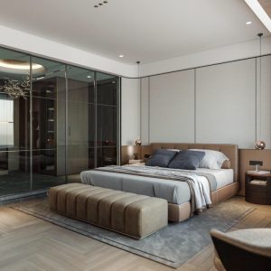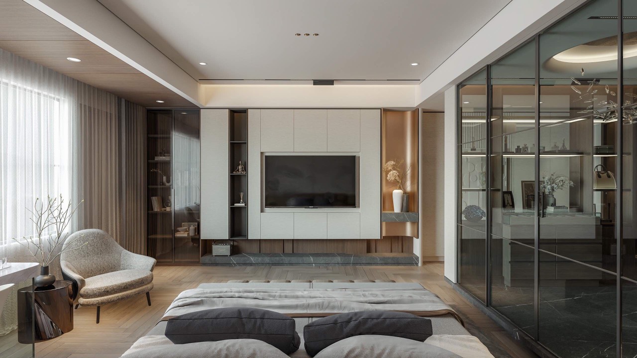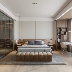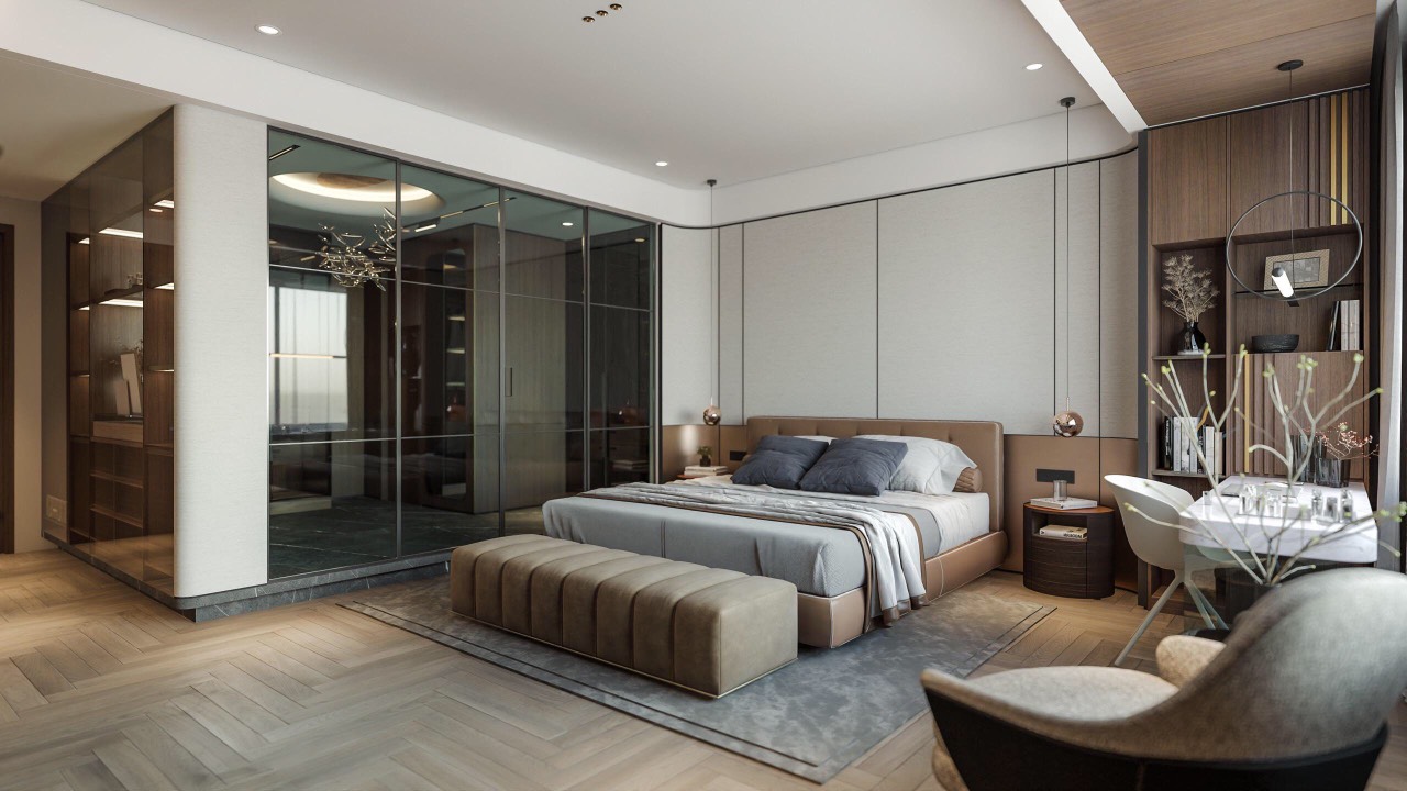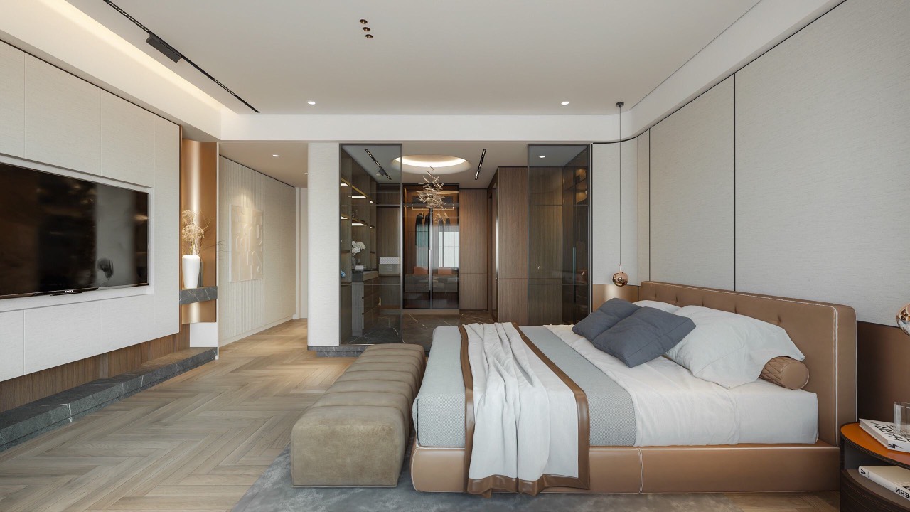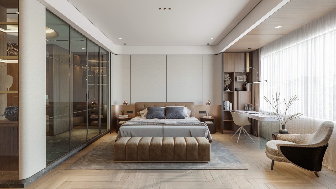 Dự án nội thất anh Tuấn do Eco Home Design thiết kế được định hình theo phong cách hiện đại, tinh giản và sang trọng có chiều sâu, ưu tiên trải nghiệm sống thoải mái và tiện nghi cho gia chủ. Không gian được tổ chức mở nhưng kiểm soát tốt bằng hệ vách kính khung kim loại, giúp kết nối phòng ngủ, khu thay đồ và khu sinh hoạt một cách liền mạch mà vẫn đảm bảo sự riêng tư cần thiết.