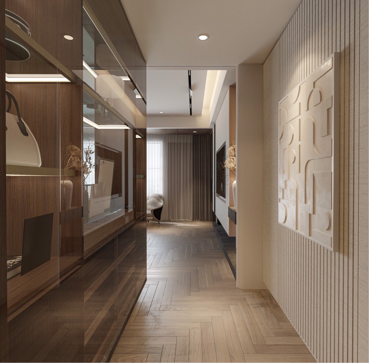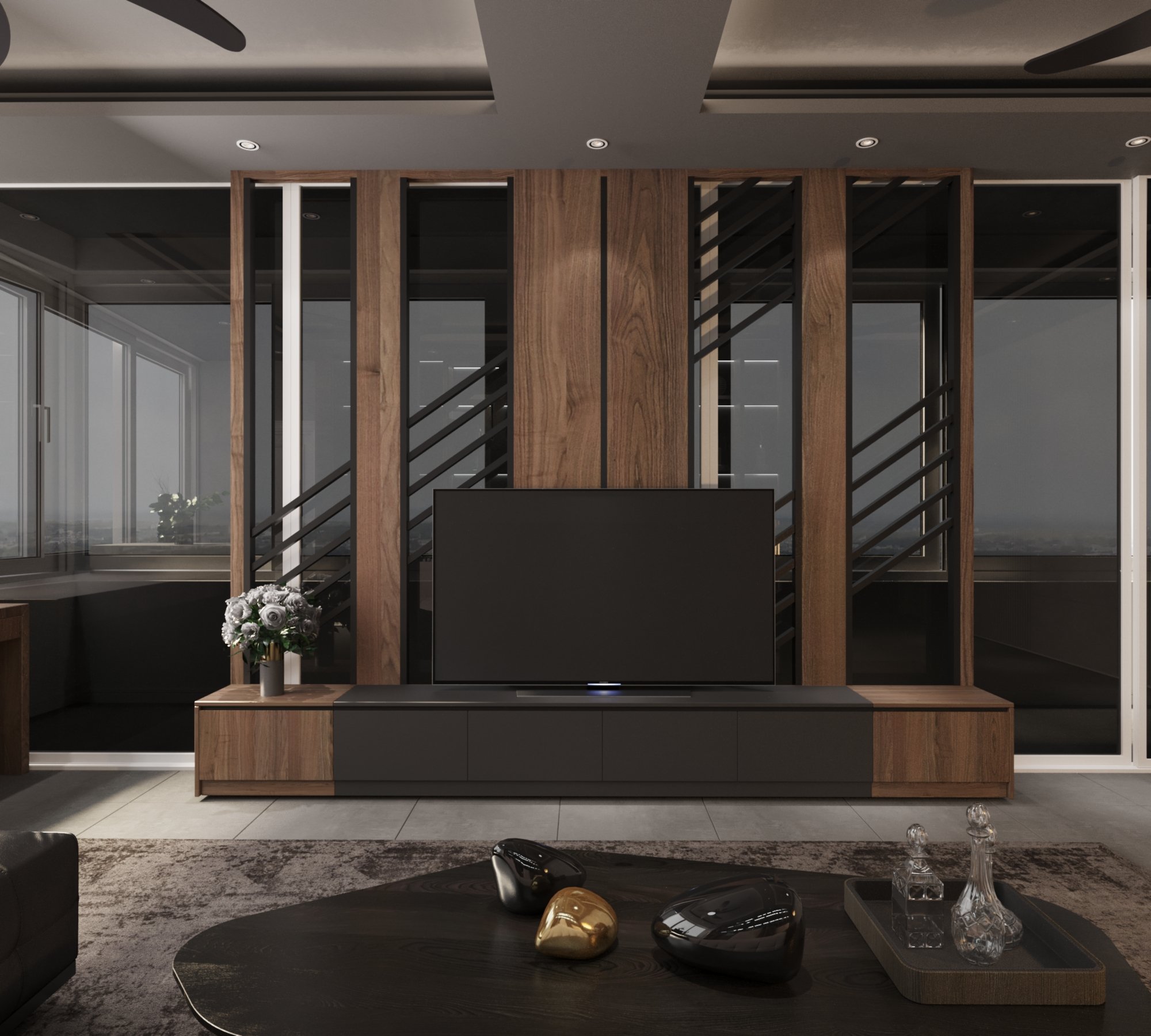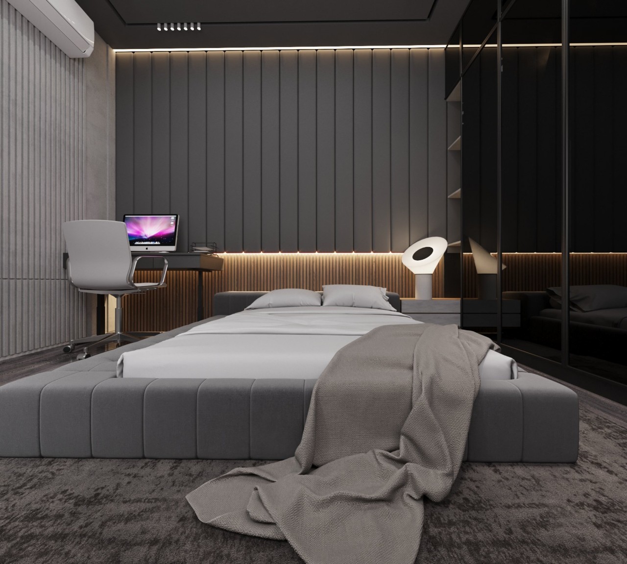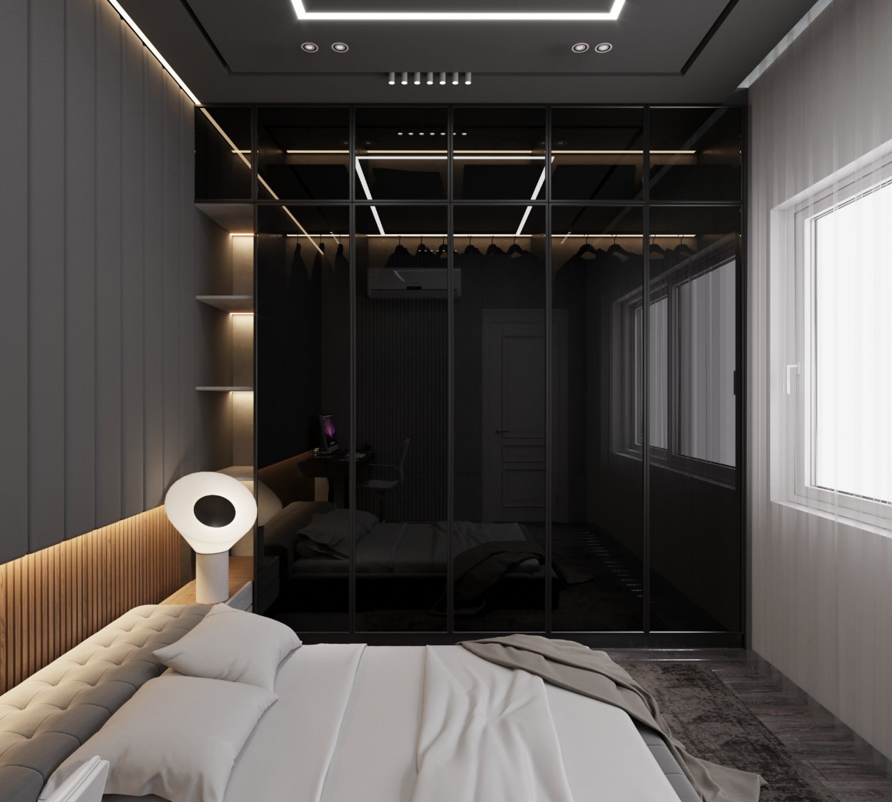 Dự án nội thất anh Tuấn do Eco Home Design thiết kế được định hình theo phong cách hiện đại, tinh giản và sang trọng có chiều sâu, ưu tiên trải nghiệm sống thoải mái và tiện nghi cho gia chủ. Không gian được tổ chức mở nhưng kiểm soát tốt bằng hệ vách kính khung kim loại, giúp kết nối phòng ngủ, khu thay đồ và khu sinh hoạt một cách liền mạch mà vẫn đảm bảo sự riêng tư cần thiết.